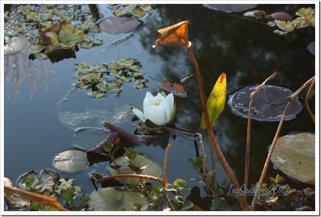 This is a poor white waterlily in the pond valiantly blooming away in the cold air.